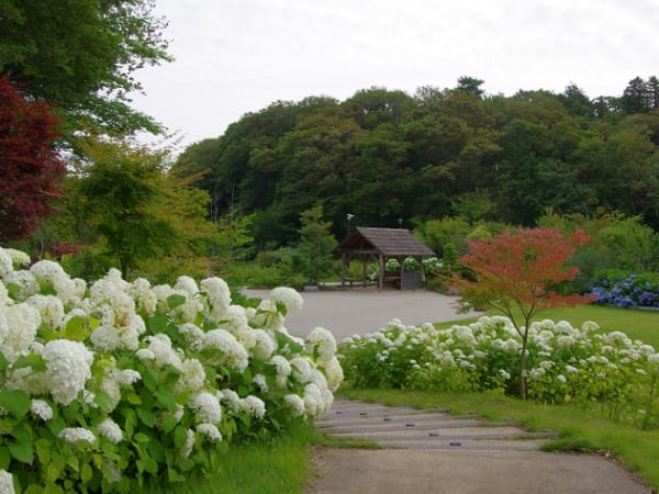 初夏の「花ファンタジア」ではアナベルやカシワバアジサイなど爽やかな白のアジサイ(見ごろ・5月中旬~6月中旬)をはじめ、水辺ではスイレンが観賞できます。煙が立ち込めているように見えるスモークツリー...